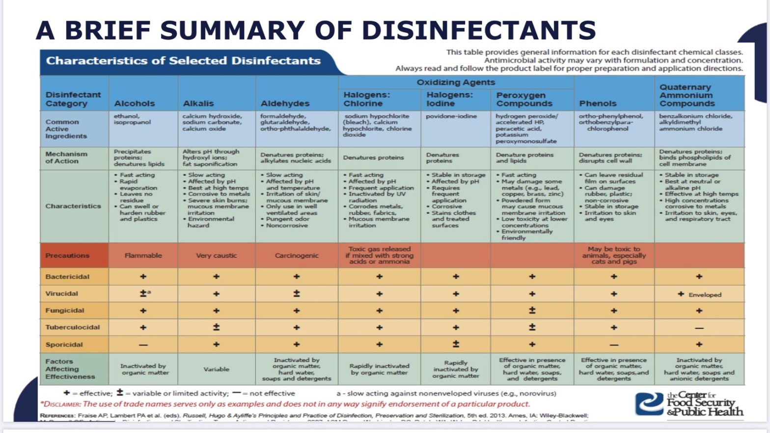 ตารางจากสถาบัน The center of food security and public health เป็นข้อมูลของสารฆ่าเชื้อตามชนิดของสารเคมี ประสิทธิภาพของสารในการฆ่าเชื้อขึ้นอยู่กับสูตรและความเข้มข้นของสารนั้นๆ โปรดอ่านฉลากสินค้าและปฎิบัติตามคำแนะนำของสินค้านั้นๆ การเลือกใช้สารฆ่าเชื้ออย่างมีความเข้าใจ จะทำให้เกิดประโชน์และช่วยให้เราปลอดภัยจากการใช้งานและเกิดประสิทธิภาพต่อการฆ่าเชื้อ